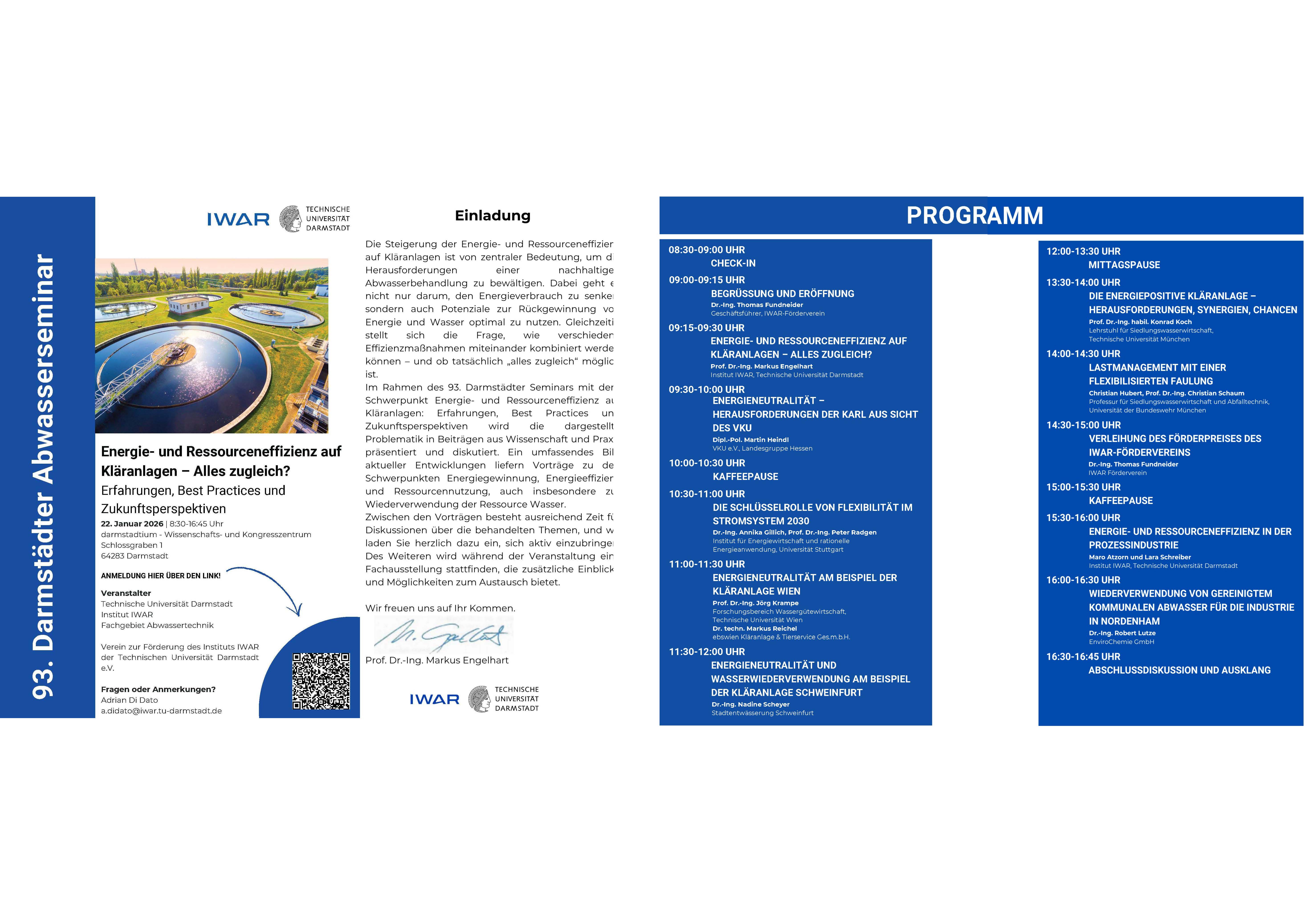 Weitere Informationen finden sich auch im Veranstaltungsflyer – 93. Darmstädter Abwasserseminar. Die Anmeldung zur Veranstaltung ist online möglich: https://www.iwar.tu-darmstadt.de/iwarinstitut/abwasserseminar/anmeldung/anmeldung.de.jsp.